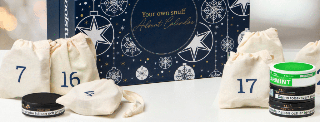 Snustillverkaren Swedish Match har sedan 2023 en adventskalender med tobaksfri snus. Bakom varje lucka finns en unik snusdosa så att du kan prova på olika sorter, smaker och styrkor från Swedish Matchs sortiment.